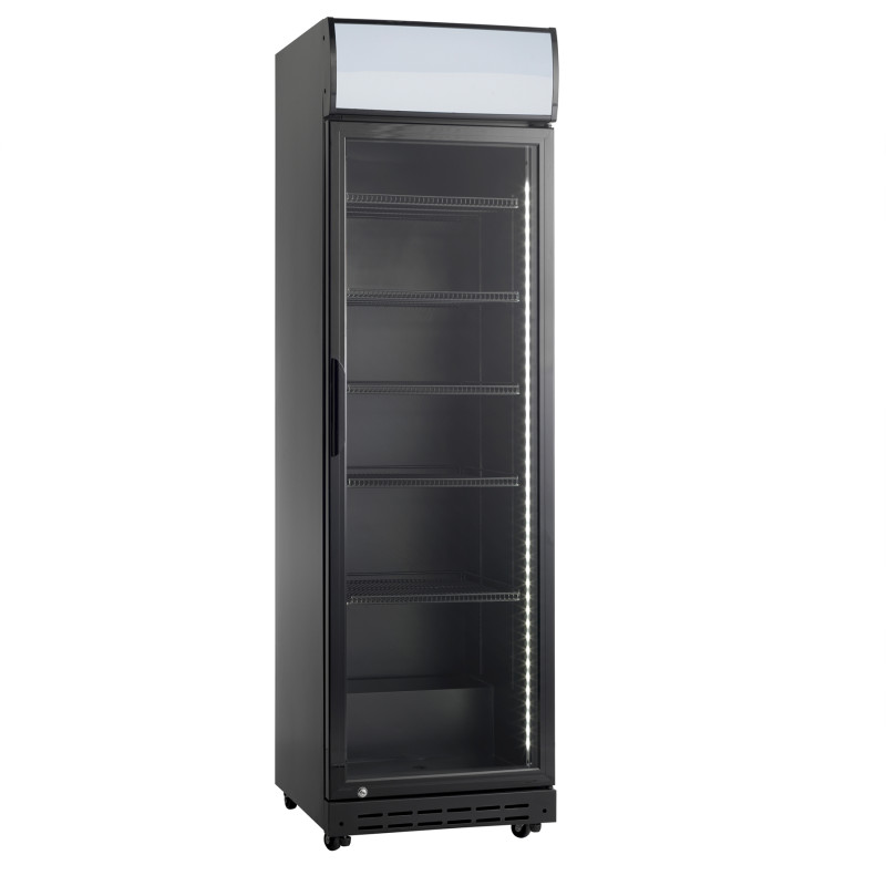 Parodos gėrimų šaldytuvas su apšviestu reklaminiu skydeliu, kurio tūris 386 l. Šaldytuvas skirtas daugeliui gastronominių operacijų. Šaldytuvas pagamintas šiuolaikiško juodo dizaino. Interjerą apšviečia vertikali LED juosta. Kad būtų lengviau organizuoti vidaus erdvę, šaldytuve yra reguliuojamos juodos spalvos lentynos. Varstomos durys yra su savaime užsidarančiomis ir užraktu.