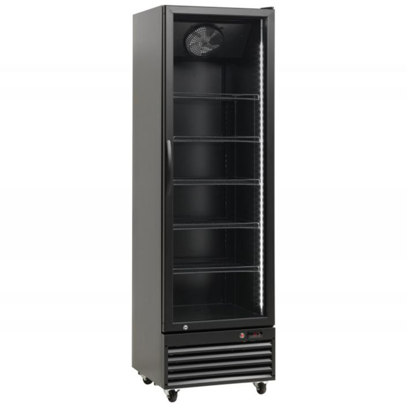 Parodos gėrimų šaldytuvas be šviečiančio reklaminio skydelio, šiuolaikiško juodo dizaino. Šaldytuvas skirtas pristatyti ir parduoti šaltus gėrimus. Šaldytuve yra galingas vidinis LED apšvietimas , kuris užtikrina optimalų eksponuojamo gaminio matomumą. Šaldytuve taip pat yra savaime užsidarančios, įstiklintos sparno durys, 5 reguliuojamos vielos lentynos, raktas ir spyna. Šaldytuve yra ratukai, kuriuos lengva valdyti.