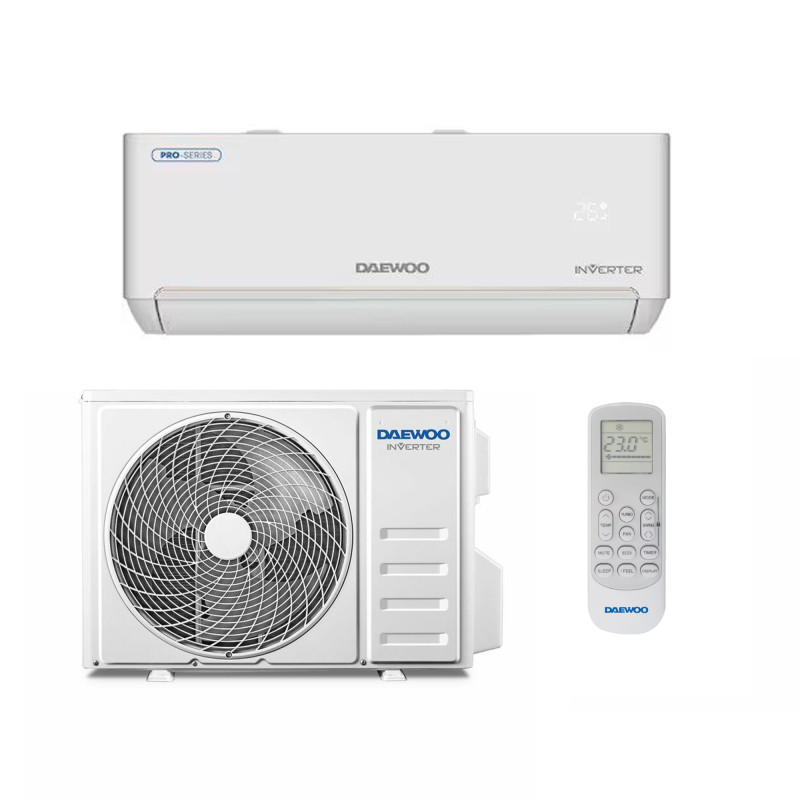 Air conditioner Daewoo DAC 24PROW, 24000 Btu, inverter, Wi-Fi, Ag ion filter, self-cleaning function, A++ class, white. The 24000 BTU Daewoo air conditioner is suitable for a room of approximately 67 square meters. It provides optimal cooling or heating, depending on your needs. Energy efficiency for cooling A++ / heating A+++. Self-cleaning and high-temperature sterilization. 4 filter types. Eco mode. Cooling and heating. Inverter compressor. 4 ventilation directions. 7 ventilation levels. TURBO function for fast cooling. 7100 W. Indoor unit weight - 14 kg; Outdoor unit weight - 39 kg.