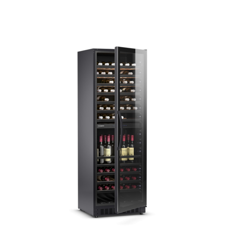 Šiame elegantiškame stikliniame vyno šaldytuve yra dvi atskiros temperatūros zonos, kurias galima nustatyti pagal poreikį - raudonam vynui, baltam vynui, šampanui ir net atšaldytiems gėrimams. Stumdomos lentynos organizuoja vyno kolekciją ir leidžia patogiai pasiekti. Didelė talpa iki 115 butelių. Erdvioje vyno spintelėje yra šviesos diodų žibintai iš abiejų pusių. Gerai sukonstruota šildymo ir aušinimo technologija užtikrina, kad jūsų pasirinkta temperatūra būtų greitai pasiekiama ir patikimai palaikoma. Nors efektyvi oro cirkuliacijos sistema, anglies filtras ir vandens rezervuaras sukuria puikų klimatą, kad jūsų vynas išnaudotų visas jo galimybes.